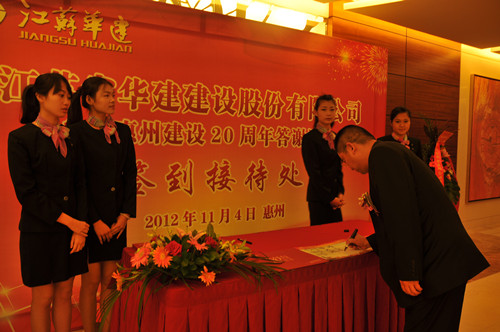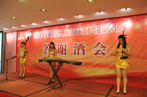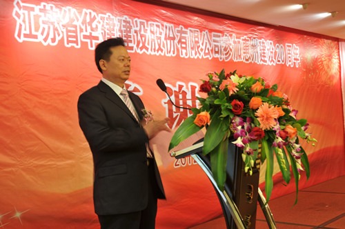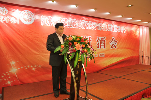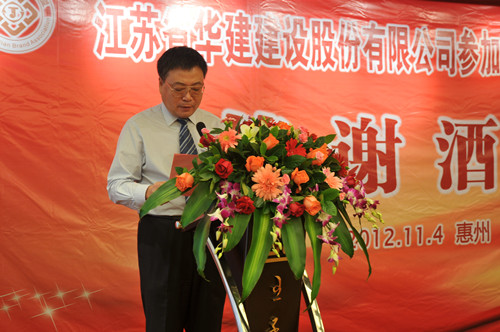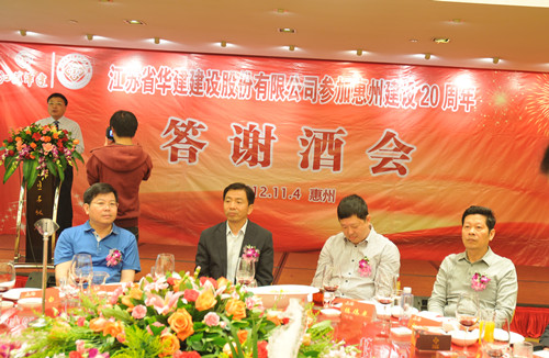 114,公司在惠州隆重舉辦參加惠州建設(shè)20周年答謝酒會(huì),副董事長、總經(jīng)理宗有農(nóng)主持并作開場致辭。惠州市有關(guān)政府部門、部分合作方企業(yè)的負(fù)責(zé)人,華建聯(lián)盟成員單位負(fù)責(zé)人,公司董事、監(jiān)事和高管等130余人出席酒會(huì)。惠州公司總經(jīng)理華恒榮介紹了公司參加惠州建設(shè)二十年的有關(guān)情況。惠州市工商聯(lián)主席、恒宇實(shí)業(yè)發(fā)展公司董事長楊滿芳代表合作方發(fā)言,惠州市住房和城鄉(xiāng)規(guī)劃建設(shè)局副局長陳訓(xùn)政代表政府主管部門致辭,分別對江蘇華建進(jìn)惠施工二十周年表示祝賀。公司董事長陸金龍代表總部對惠州市有關(guān)政府部門、相關(guān)合作方和社會(huì)各界人士給予公司的關(guān)心和支持表示誠摯的感謝,并表達(dá)了進(jìn)一步加大支持力度、加強(qiáng)戰(zhàn)略合作、加快科學(xué)發(fā)展的意愿。