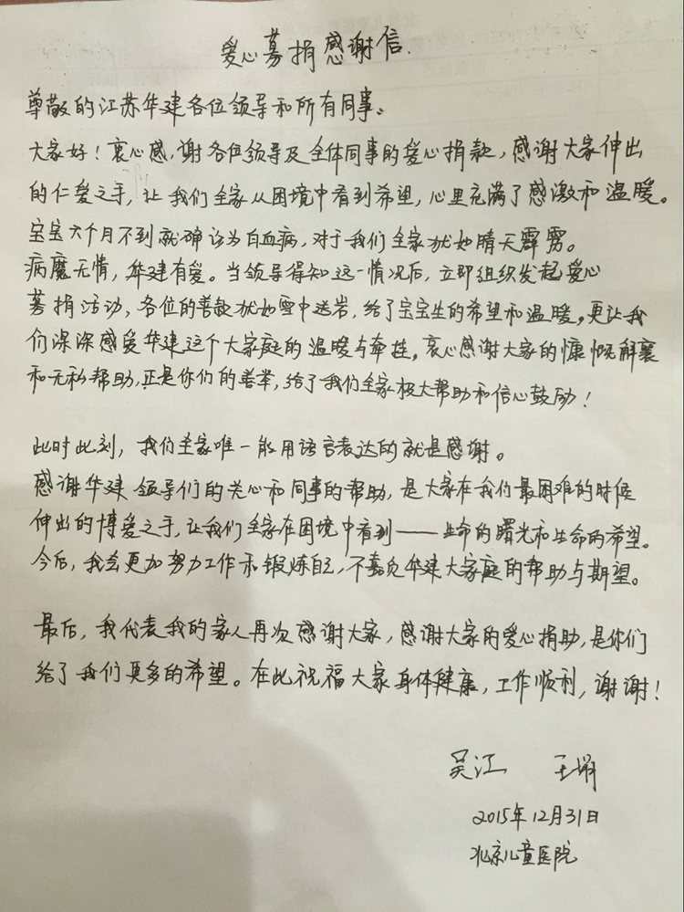 吳江是新加坡蘇揚公司的員工,近期他六個月大的兒子被診斷患有白血病,給他的家庭帶來了極大的精神負擔(dān)和經(jīng)濟壓力,孩子患病消息也牽動著公司廣大干部員工的心,得知這一消息后,公司黨委高度重視,工會迅速發(fā)起愛心募捐倡議,各單位、各部門廣大干部員工踴躍奉獻愛心,截至目前已經(jīng)籌集愛心捐款十萬余元。吳江特意發(fā)來感謝信,對給予其家庭幫助的同志們表示誠摯感謝!
