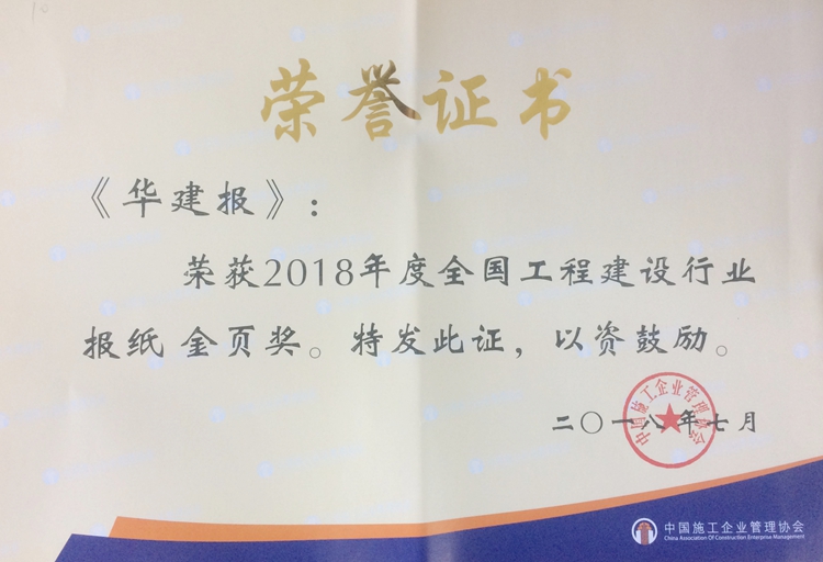 7月18日至20日中國施工企業管理協會2018年度工程建設企業文化論壇暨通聯員工作會議在蘇州召開。公司內刊《華建報》再度獲評“2018年度全國工程建設行業報紙金頁獎”,公司翟法寶獲評“2018年度中國施工企業管理協會優秀聯絡員”。