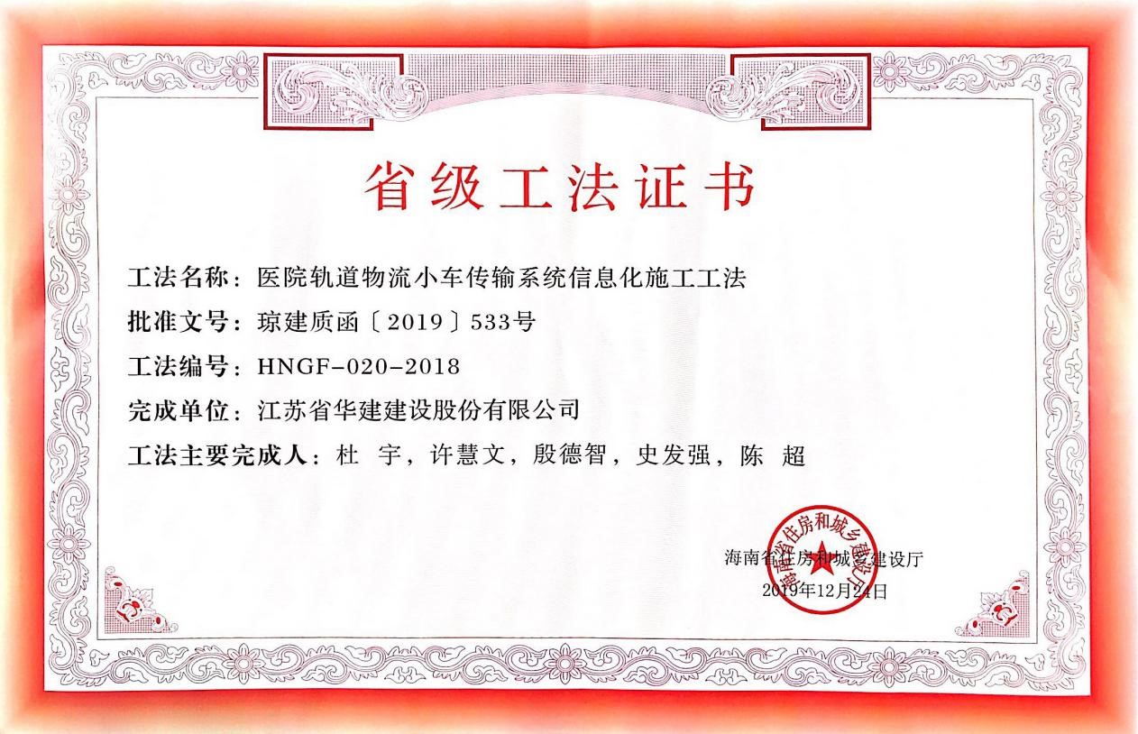 海南分公司新增1項省省級工法 時間:2020-01-10 3875 2019年12月24日,海南省住房和城鄉(xiāng)建設廳公布了2018年度海南省省級工法評審結(jié)果,我司《醫(yī)院軌道物流小車傳輸系統(tǒng)信息化施工工法》成功入選。