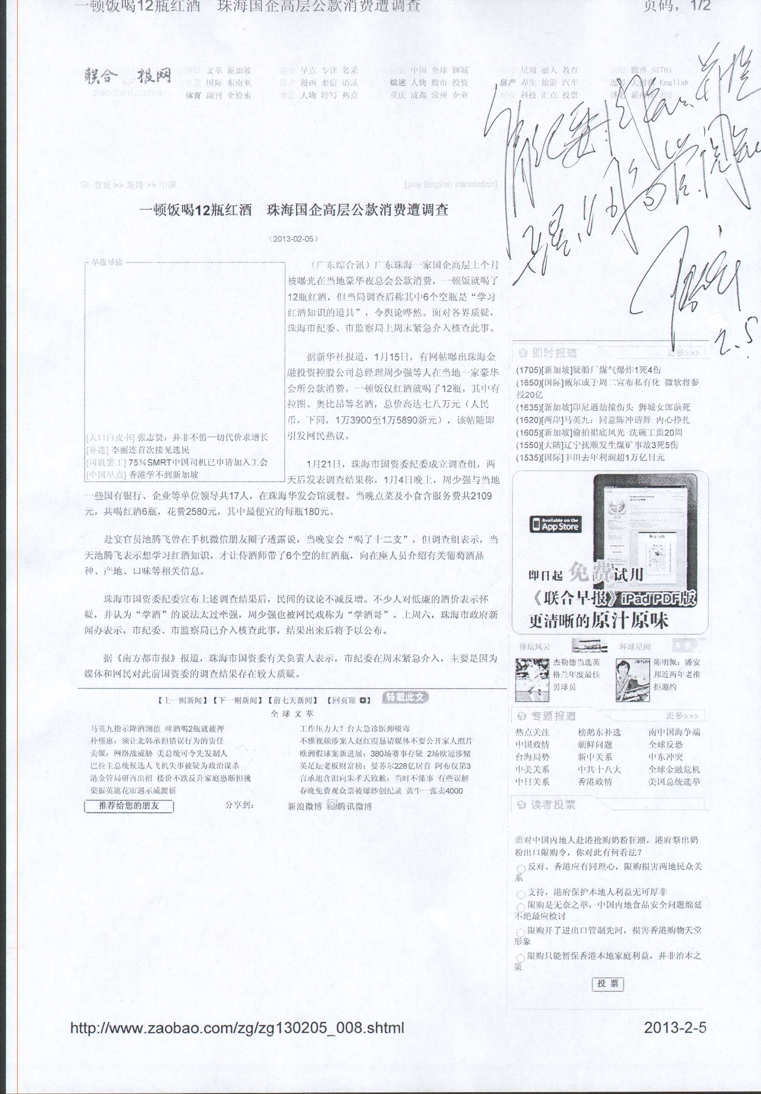 陸金龍董事長對網(wǎng)載“珠海國企高層公款消費(fèi)”作出批示,提醒公司高管引以為戒2月5日聯(lián)合早報(bào)網(wǎng)...