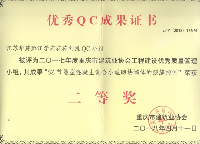 近日,重慶市建筑業協會發文表彰了一批優秀QC成果,江蘇華建黔江學府花苑劉凱QC小組被評為2...