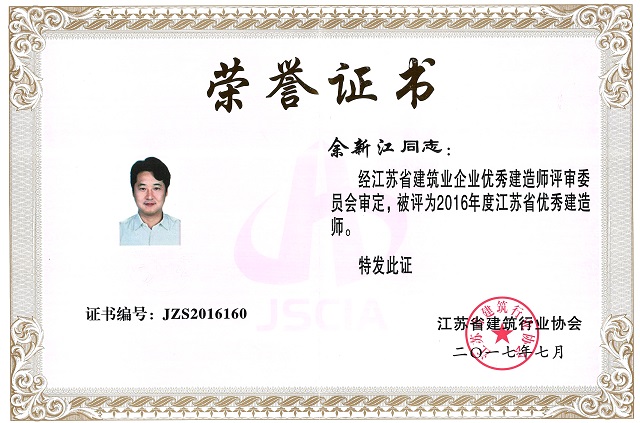 日前,江蘇省建筑行業(yè)協(xié)會下發(fā)了《關(guān)于2016年度江蘇省建筑業(yè)優(yōu)秀建造師的決定》,公司余新江...