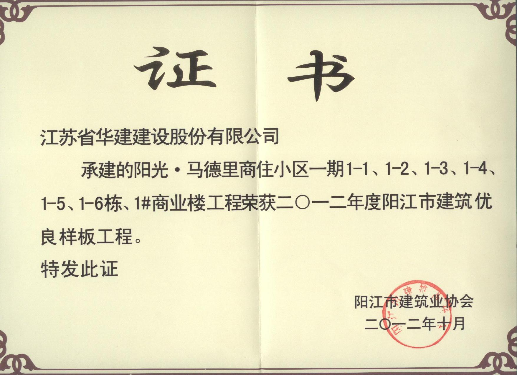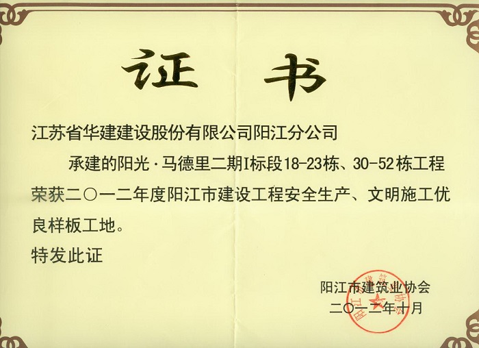 2012年陽(yáng)光馬德里二期陽(yáng)江市建設(shè)工程安全生產(chǎn)、文明施工優(yōu)良...