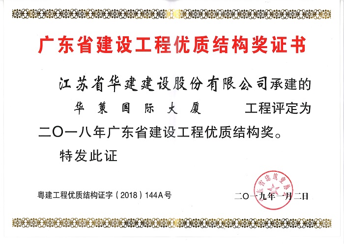 華策國際大廈獲2018年廣東省建設(shè)工程優(yōu)質(zhì)結(jié)構(gòu)獎