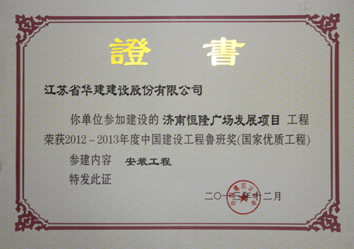 濟南恒隆廣場喜獲“2012-2013年度中國建設工程魯班獎(國家優質工程)” 時間:2013-12-09 5658 12月5日,2012-2013年度中國建設工程魯班獎表彰大會在北京友誼賓館舉行,中國建筑業協會對2012-2013年度國內優秀建筑工程進行了隆重表彰,上海公司參建的濟南恒隆廣場喜獲全國建設工程最高榮譽——“魯班獎”,這是我公司第一次獲此殊榮。江蘇華建副總經理、上海公司總經理楊杰出席了頒獎大會。