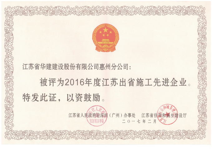 惠州公司榮獲“2016年度江蘇出省施工先進企業”稱號 時間:2017-03-28 2830 3月24日,江蘇省人民政府駐深圳(廣州)辦事處和江蘇省住房和城鄉建設廳在海口召開2017年江蘇建筑業南方區工作會議,表彰了一批施工先進企業、優秀企業經理、優秀建造師和先進個人。惠州公司獲評“2016年度江蘇出省施工先進企業”,總經理周群利被評為優秀企業經理,黃秀剛被表彰為質量安全先進個人,邵群斌被表彰為經營財務先進個人,劉磊被表彰為新聞報道先進個人。