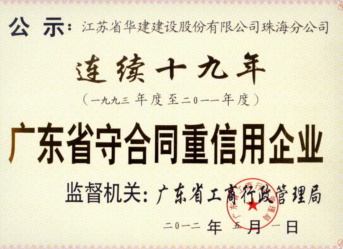珠海公司連續19年榮獲“廣東省守合同重信用企業”榮譽稱號 時間:2012-06-28 6121 珠海公司連續19年榮獲“廣東省 守合同重信用企業”榮譽稱號 五月份珠海分公司被廣東省工商行政管理局授予“連續十九年廣東省守合同重信用企業”榮譽稱號。