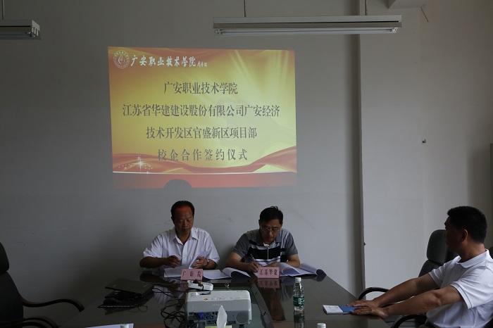 6月4日,江蘇華建廣安官盛新區建設項目部與廣安職業技術學院校企合作簽約儀式,在廣安職業技術學院春暉樓三樓會議室舉行。江蘇華建珠海區域公司、重慶分公司副總經理嚴正濤、重慶二處、八處、市政工程處項目管理人員和廣安職業技術學院院長陳永龍、副院長王甫茂、教務處、校企合作辦、建筑與城市規劃系部門負責人等參加儀式。