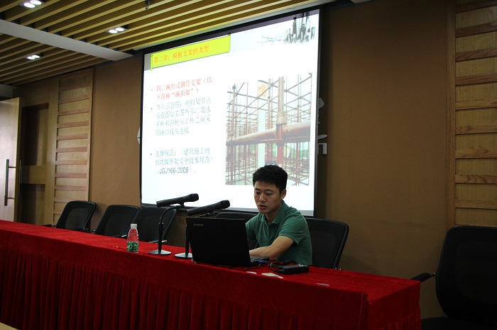 會上,安全設備處主任丁瑞華、副主任陳榮就腳手架和模板支架搭設具體細節實施、施工現場存在的問題等,以圖文并茂的形式展示了關鍵點與控制要領,使培訓人員對腳手架搭設和模板支架搭設安全控制點更加清晰明朗。盧總分享了北京綠色施工和公司魯班獎項目考察學習的經驗感悟,就其中珠海公司可以借鑒學習的部分做了深入細致的講解,他激勵大家要以魯班精神打造華建的精品工程。