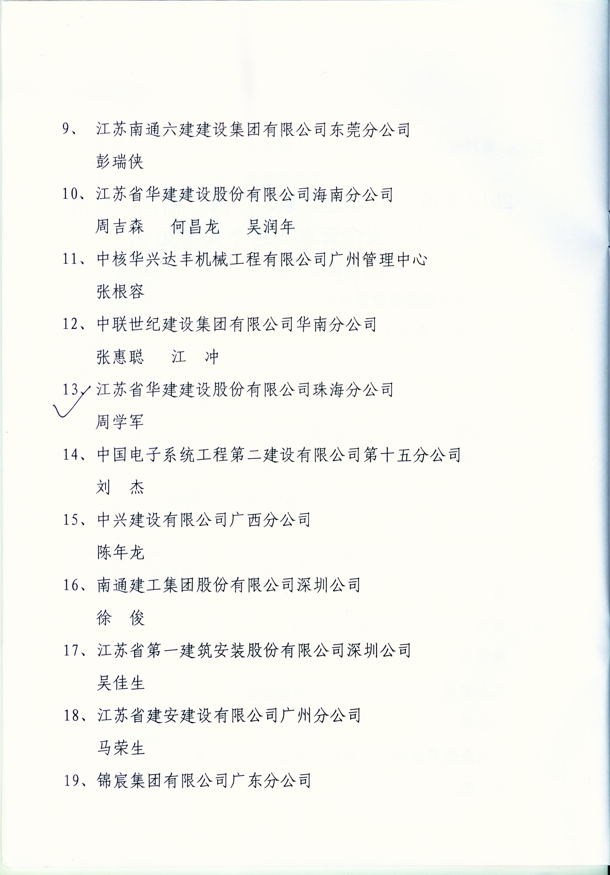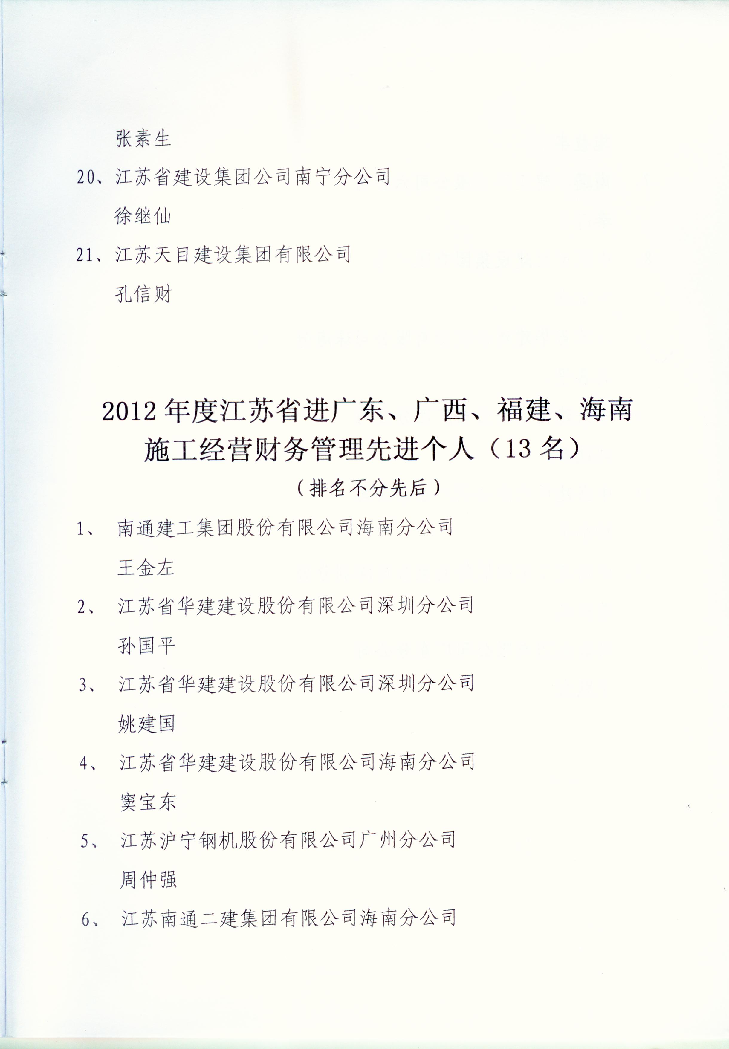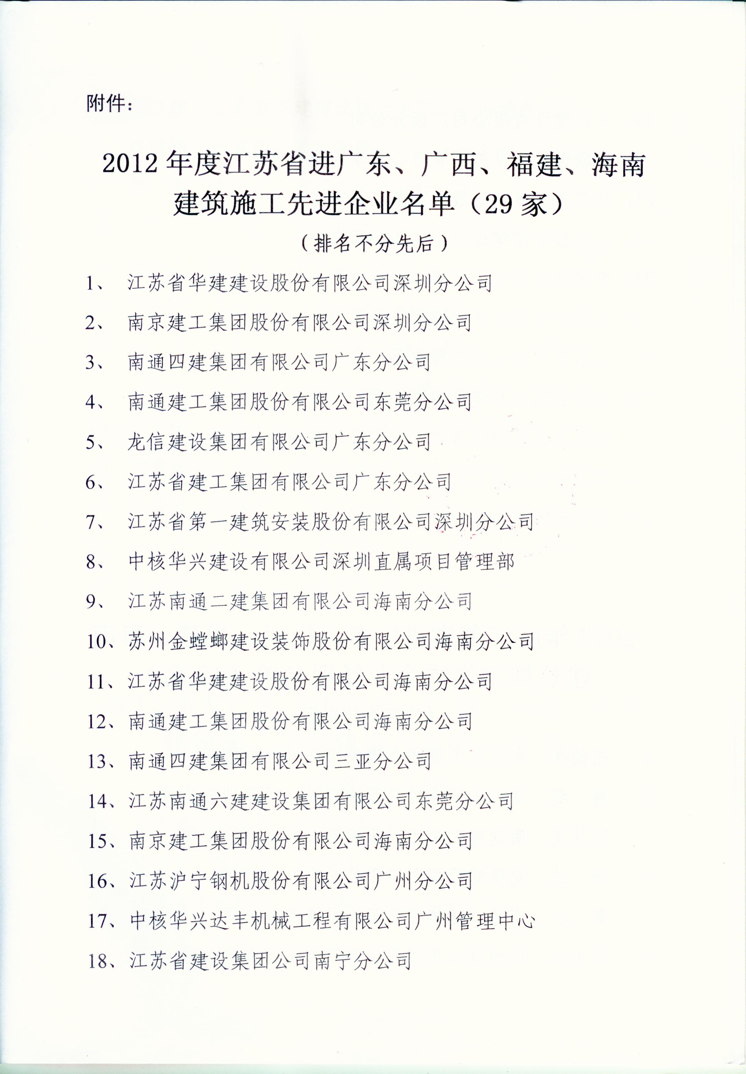 2012年江蘇進粵、桂、閩、瓊建筑施工先進企業、優秀企業經理、優秀建造師及經營財務管理、質量安全管理先進個人